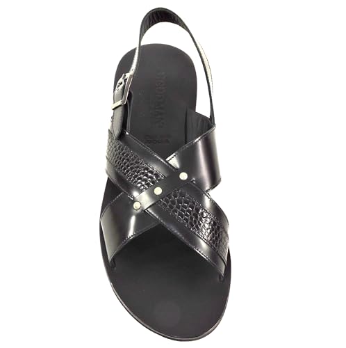 Good Man Men's Black Leather Slingback Sandals, Criss-Cross Design, Comfort Flat Sole, Silver Buckle Closure, Summer Casual 7