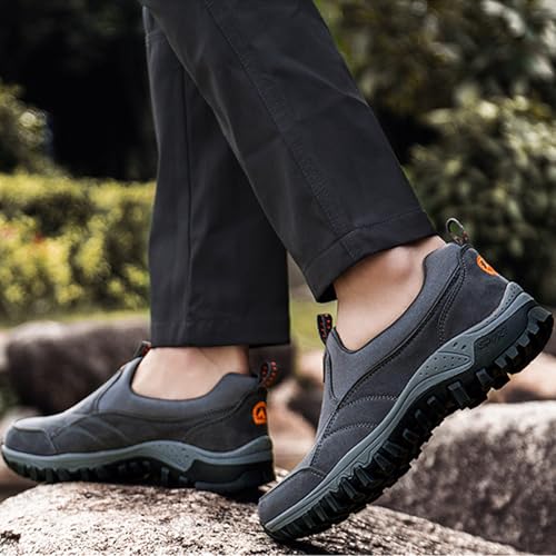 • [Slip-on Convenience] These men's hiking shoes feature a slip-on design, eliminating the need to bend over to tie laces. Simply lift your foot to put them on and off, making them ideal for those with hallux valgus. They are especially suitable for those with limited joint mobility and difficulty bending over. They reduce strain on the foot when putting on and taking off the shoes