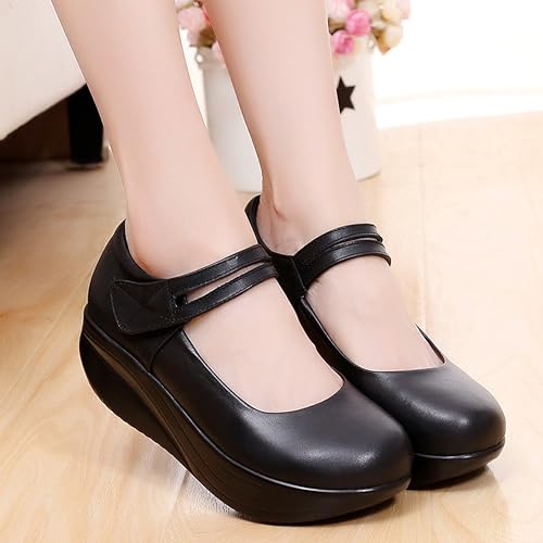 HOT ! Women's Leather Wedge Mary Jane Laces Hook and Loop Comfortable Round Toe Soft Sole Non-Slip Chunky Platform Casual Pumps for Walking, Working, Dating