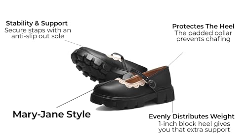 • Classic Black Mary Jane Style: Featuring a chic black design, these Mary Janes add sophistication to any outfit with a classic ankle strap and round toe.