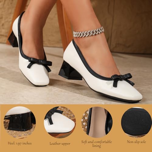 Women's Leather Bow Chunky Heel Pumps Fashion Closed Square Toe Block Heel Slip-On Shallow Wedding Shoes Party Dance Work Formal Shoes 6