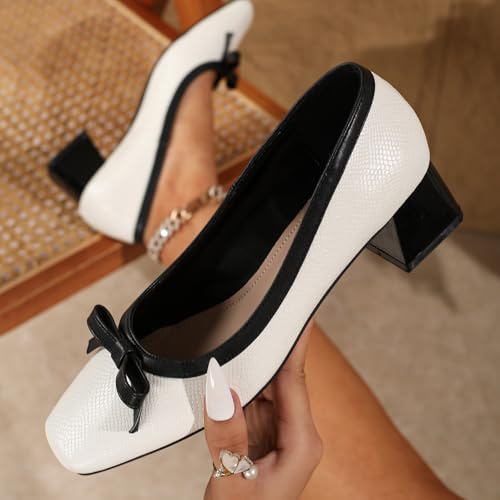 Women's Leather Bow Chunky Heel Pumps Fashion Closed Square Toe Block Heel Slip-On Shallow Wedding Shoes Party Dance Work Formal Shoes 7