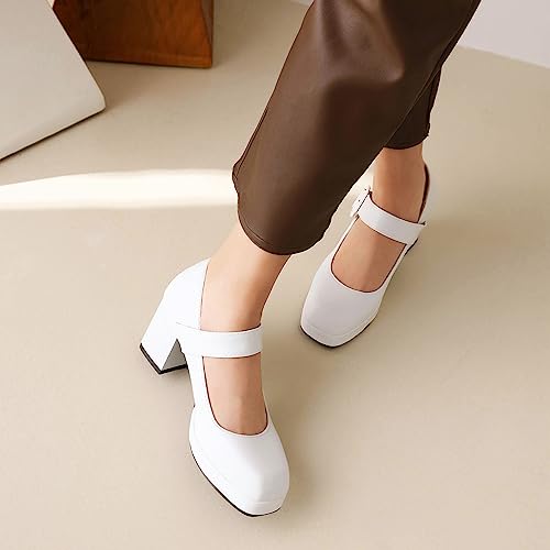 SHEMEE Women's Square Toe Mary Janes Chunky Heels Platform Shoes Ankle Strap Buckle Block High Heel Dress Pumps 7