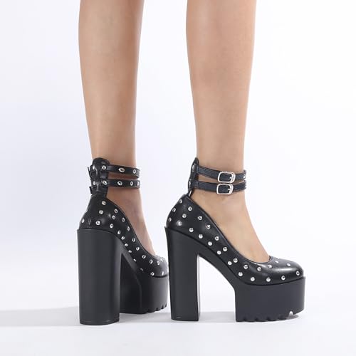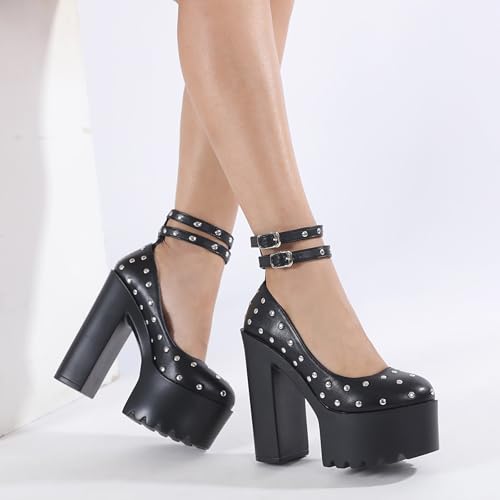 Women's Leather Studded Platform Chunky Heel Gothic Pumps Fashion Ankle Strap Lug Sole Chunky High Heels Punk Shoes Y2k Wedding Party Dress Shoes 7