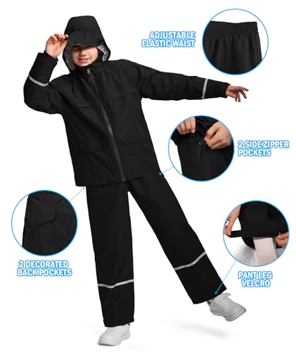 Kids Rain Suit Jacket and Pants Set with Reflective Strips Adjustable Hood Flap Pocket for Boys Girls 3