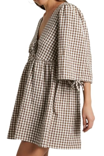 HOT ! Women's Gingham Puff Sleeve Tie Front Babydoll Mini Dress