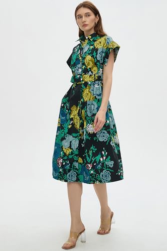 D-Sun Women Button Down Shirt Dress V-Neck Floral Printed Short Sleeves Mid Shirt Dress Belt A-Line Party with Pockets 1