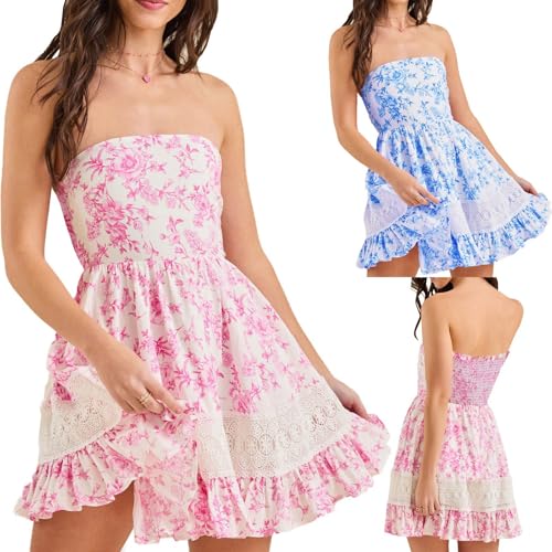 HOT ! Women's Floral Tube Top Dress Casual Summer Strapless Mini Dresses Lace Patchwork Cute Ruffled Flowy Short Sundress