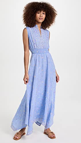 • Geometric floral embroidery with metallic threading, Banded V neck, Asymmetrical hem, Smocked elastic waistband