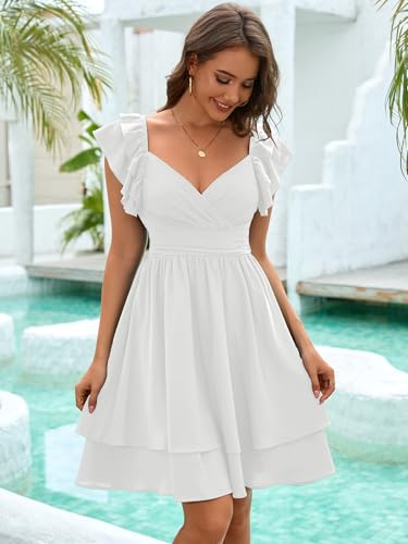Women's Summer Dress Casual Wrap V Neck Flutter Sleeve Double Layer Ruffle Wedding Guest Short Mini Dresses 6