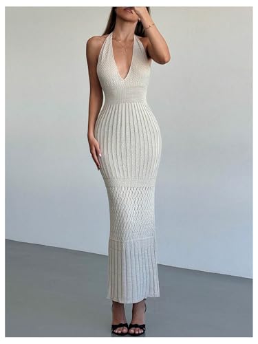 HOT ! SOLY HUX Women's Crochet Knit Halter Dress Deep V Neck Sleeveless Tie Backless Bodycon Long Dresses