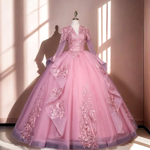 • ★Features:Long sleeves quinceanera dresses,quince dress,ball gown for women,v-neck sweet 16 dresses,tiered tulle birthday gowns,lacec appliques formal party gowns,15 dresses for quinceanera,long evening party dresses,plus size prom gowns,vestidos de prom