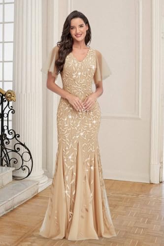 HOT ! Women‘s Formal Dress Sparkly Sequin Tulle V Neck Bodycon Ruffles Sleeve Mermaid Evening Party Long Dresses