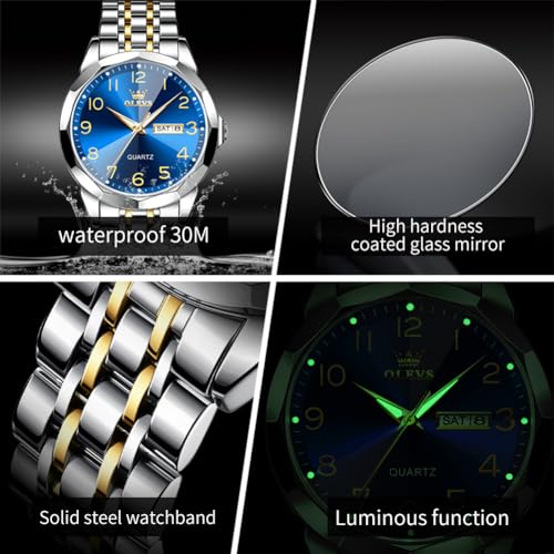 • 【Luxury Fashion Design】OLEVS Mens Watches, with a fashionable diamond shaped dial design and a simple blue face, is fancy but elegant. It can make you look calm and dignified in business situations as well as lively in your daily life.The gold sliver wear-resistant stainless steel strap complements your calm temperament and high-end style. All styles can be worn casually and look good and glamorous.