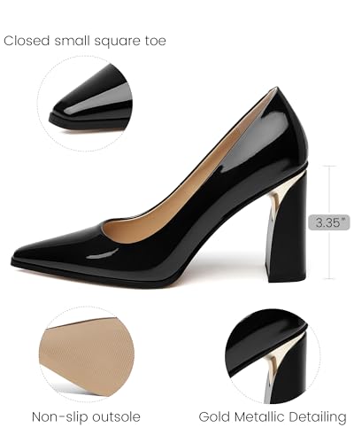 • Design: Closed square toe; Chunky heel with gold-tone metallic detailing; premium patent leather upper; Non-slip outsole.