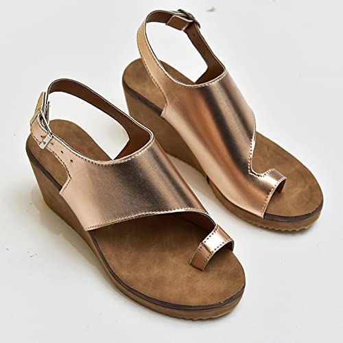 HOT ! Orthopedic Bunion Corrector Sandals for Women Comfy Platform Wedges PU Leather Shoes Summer Ankle Strap Flip Flops Casual Walking Shoes,Gold,US7/EU38