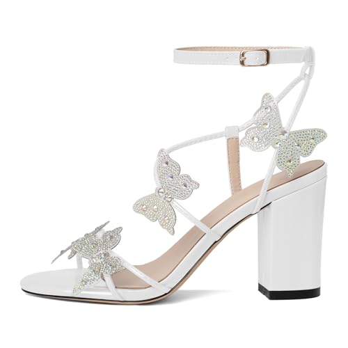 Joseywade Butterfly Heels Heeled Sandals Rhinestone Crystal Butterflies Heels Open Toe Chunky Block High Heels 3.5 Inch Women's Shoes 4