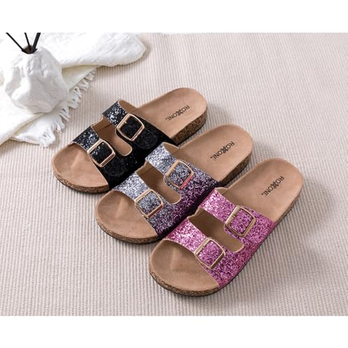 More information about Roxoni Women's Party Gliters Comfort Flat Sandals Double Buckle Adjustable Straps Flat Slides Footbed Suede