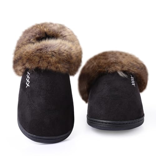 • Classic Winter Fuzzy Slippers: Featuring a breathable microsuede upper design, along with high-quality and comfort fluffy faux fur collar trim, lined with thickening fleece, the house slippers wrap your feet very well, keep your feet nice and toasty whether in socks or bare feet.The side stitching detail and faux fur collar combine together for a cute and elegant look