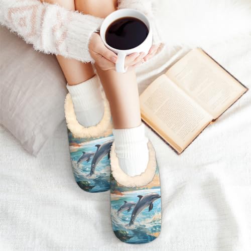HOT ! Sea Beach Dolphin Slippers for Women Men, Ocean Animal House Slippers Socks Warm Fuzzy Memory Foam Indoor Slippers Lightweight Cozy Anti-Skid Closed Back Home Shoes, Medium