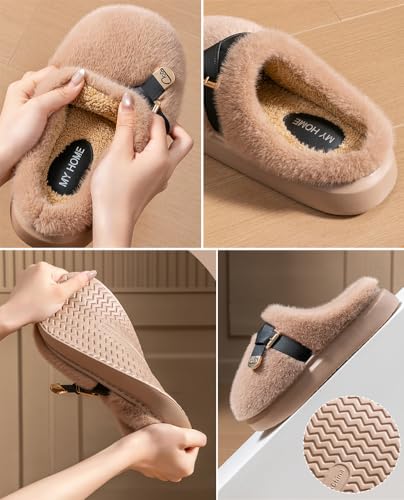 • Warm and Comfy: Well made of ultra-soft faux fur and fluffy fleece linling, these slippers provide cloud-like comfort and keep your feet cozy in cold winters