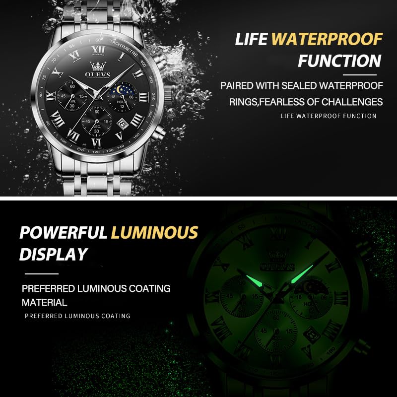 • 【OLEVS Men Watch Premium Design】Crafted with a classic stainless steel watch band,this luxury mens watch combines a black large face design with easy to read functionality.the analog silver hands contrast perfectly against the minimalist backdrop,embodying olevs mens luxury watch sophistication.providing you with full-featured services,classic watches for men,waterproof watches for men,relojes para hombres