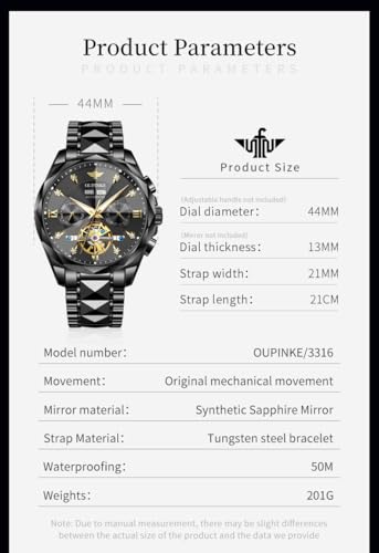 • OUPINKE Mechanical Movement: Built-in precision original mechanical movement to support the automatic self-winding. The tourbillon skeleton cancels out the errors caused by gravity on the parts of the watch's escapement. Therefore, compared with ordinary automatic watches, it is more accurate and has less error. Long service life and very suitable for men of all ages.
