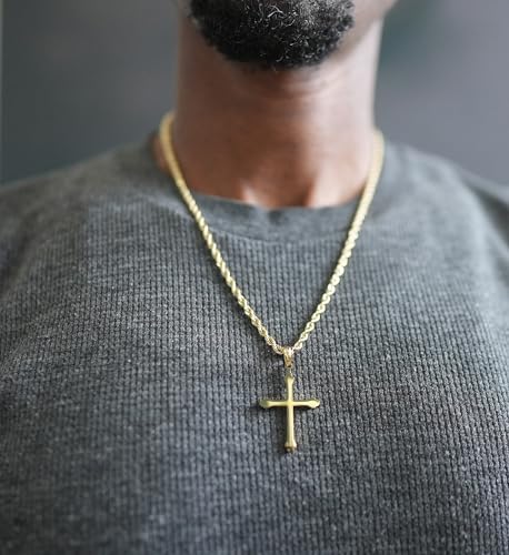 • Sturdy: High-grade Quality Gold cross Necklace Pendant with Versatile Rope Chain for men, Women. It is a long lasting and sturdy Cross necklace for daily wear without worry. The gold cross pendant Size is 35mm high and 24mm wide. The included Gold FIlled Rope Chain is 3mm wide.