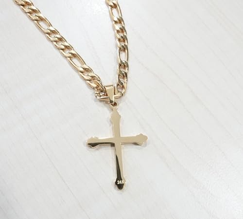 HOT ! 24K Gold Figaro Chain Style Cross Pendant Necklace 5MM Cross Necklace Clasp for MEN, WOMEN HUSBAND Thin for Charms Miami Cuban Link Diamond Cut Religious Holy