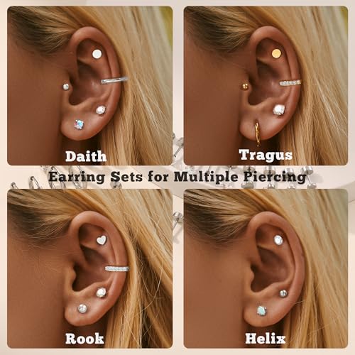 • 【Economical Earring Sets for Multiple Piercing】You can get 2 pairs hoop earrings,2 pairs huggie hoop earrings,12 pairs stud flatback earrings,includ CZ ,colorful CZ,opal,ball&heart shape surgical steel earrinngs, can be used as lobe earrings, cartilage earring or helix ear piercing jewelry, to meet any of your wearing needs.