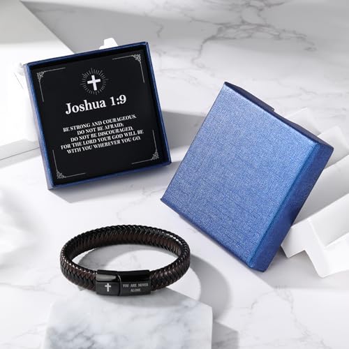 HOT ! Leather Bracelet for Men Dad Husband Boyfriend Son Grandson Gift, Braided Black Leather Bracelet with Stainless Steel Engraved Joshua Scripture You are Never Alone Jewelry