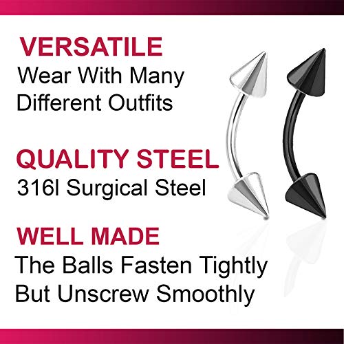 • WELL MADE - The cone spikes fasten tightly but unscrew smoothly making the curved barbell piercing are easy to use. It is POSSIBLE to use these as 16g curved barbell earring,curved barbell rook.