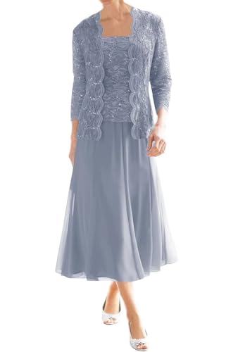 Mother of The Bride Dresses for Wedding Tea Length Lace Chiffon Formal Dress 2 Piece Grandmother Dresses with Jackets 2