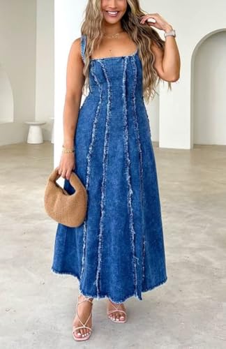 • 2025 distressed denim sundress for women, featuring adjustable shoulder strap & frayed splicing design, classic fit and flare jean dress perfectly outlines your body, open back, about ankle length