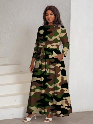 HOT ! Plus Size Maxi Dress for Curvy Women with Belt Crew Neck 3/4 Sleeve Flowy Long Outfits Sizes L to 5XL