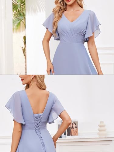 Flutter Sleeves Chiffon Bridesmaid Dresses Long with Pockets A-Line V Neck Formal Wedding Guest Dresses for Women 4