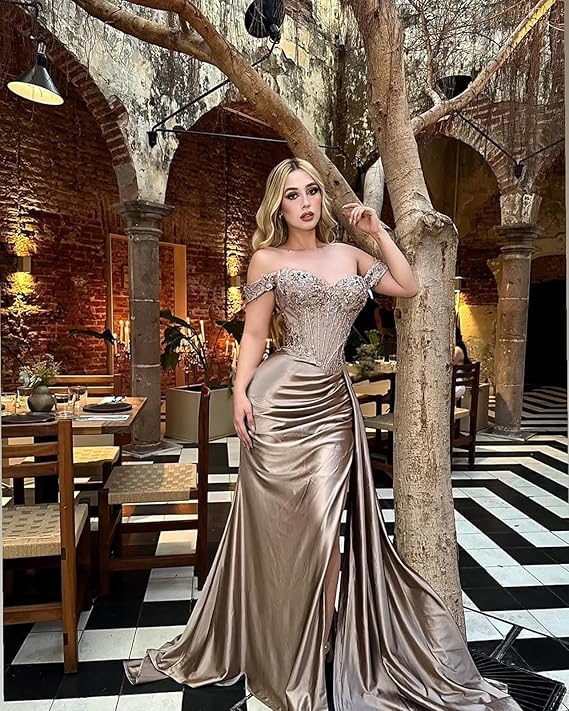 More information about Spaghetti Straps Mermaid Slit Prom Dresses 2025 Beaded Long Satin Formal Evening Gowns for Women