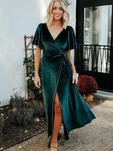 More information about Velvet Bridesmaid Dress Long for Women Flutter Sleeves V Neck Formal Gowns with Side Slit 2024