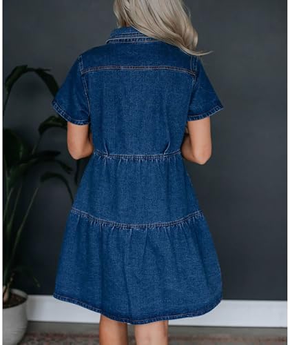 Sexyshine Women's Button Down Denim Babydoll Dress Lapel Collar Short Sleeve Flowy Tiered Ruffle Jeans Midi Dress 4