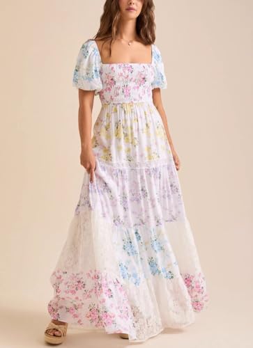Womens Boho Floral Patchwork Maxi Dress Square Neck Smocked Puff Sleeve Lace Dresses Daytime Outfits 1