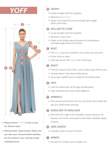 • Size: Please refer to YOFF Dress Size Chart before purchasing, We have many colors in formal dresses like pink ,sage ,orange ,baby blue ,wine red ,white and so on ,we also can offer customized style and size for you ,if our seller standard size not fit you ,and tell us your bust/hips/waist/shoulder to shoulder/height/and need time,we can make your dream come ture.