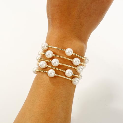 • Product Specifications: The bracelet circumference is 7.0 inches, suitable for most women's wristsEach Single Bracelet Has 5 10mm White Crystal Pearls, Matched With Delicate Gold-Plated Copper Tubes, And Linked With Elastic Threads To Form A Pentagonal Bracelet.