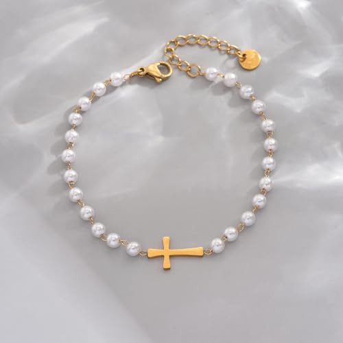 HOT ! Cross Bracelet for Women 18K Gold Plated Dainty Pearl Beaded Cross Bracelets Adjustable Stainless Steel Trendy Wedding Bridesmaid Jewelry
