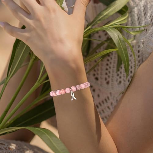 HOT ! Breast Awareness Bracelet for Women, Ribbon Charm Beaded Bracelets Natural Stone Agate Breast Survivor Self Care Inspirational Gifts Encouragement Accessories for Woman Friends Sister