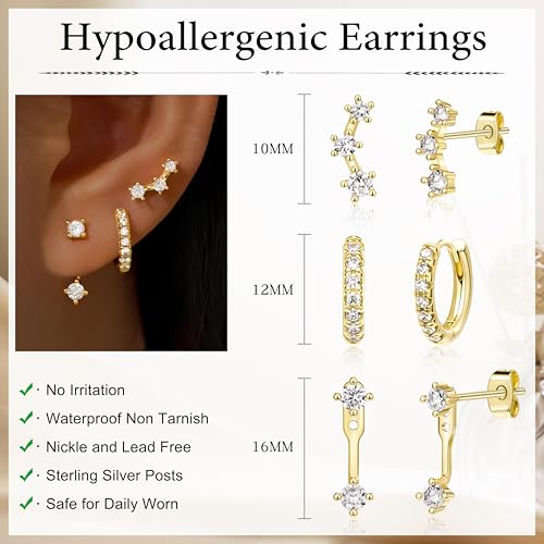 Gold Plated Stud Huggie Earrings Stack for Women Trendy, 3 Pairs Small Cute Hoop Jacket Cartilage Earring Set, Fashion Accessories Holiday Western Jewelry Gifts 5