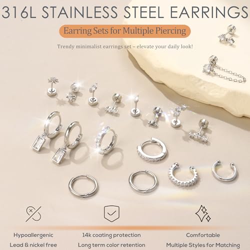 • Earring Sets for Multiple Piercing: These hypoallergenic surgical steel earrings are dainty and look more trendy, stud and hoop earring sets for multiple piercing, such as cartilage earring, helix piercing jewelry, first hole, second hole, third hole, tragus piercing jewelry, etc. Feel free to match your style