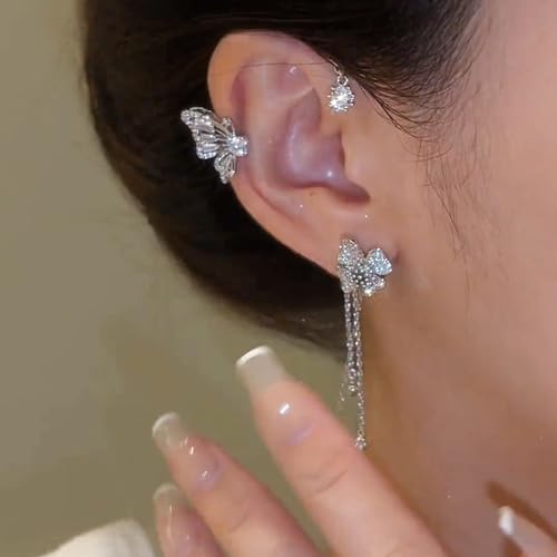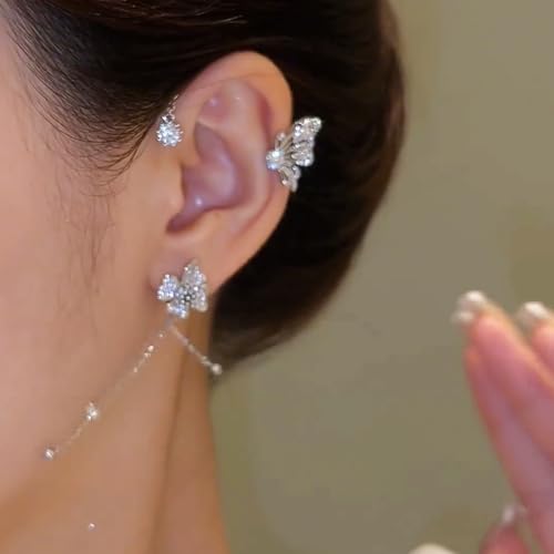 Butterfly Ear Cuffs Earrings Rhinestone Butterfly Flower Ear Wrap No Piercing Tassel Earrings for Women 3