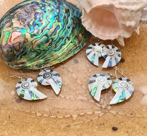 • These Abalone Shell Earrings, Mother of Pearl Earrings feature gorgeous natural Mother of Pearl and Abalone Shells artfully arranged in the shape of an open Nautilus shell. Amazing shades of color that varies from greens & pinks to purples & blues burst out as your light source changes adding a whole new dimension. Beautiful completely handmade Seashell Earrings!