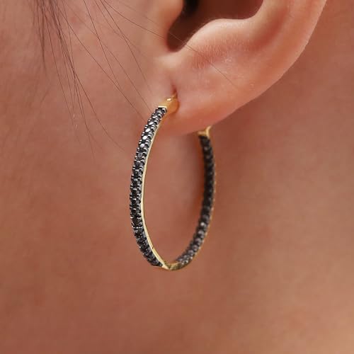 JEWEL ZONE Black Natural Diamond Accent Inside Out Hoop Earrings 14K Gold Over Sterling Silver, Gift For Her Hypoallergenic Jewelry for Sensitive Ears Large Big Hoop Earring 4