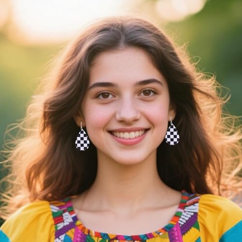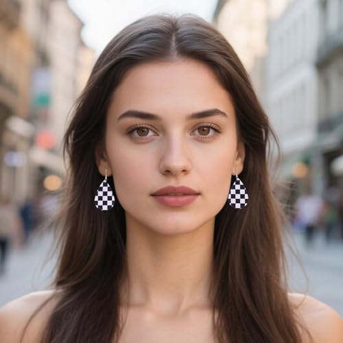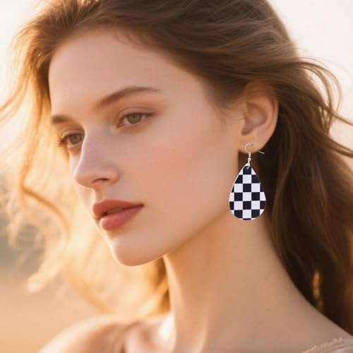HOT ! Checkered Earrings for Women, Black and White Chessboard Dangle Drop Earrings Lightweight Leather Teardrop Vintage Accessories Gift for Her